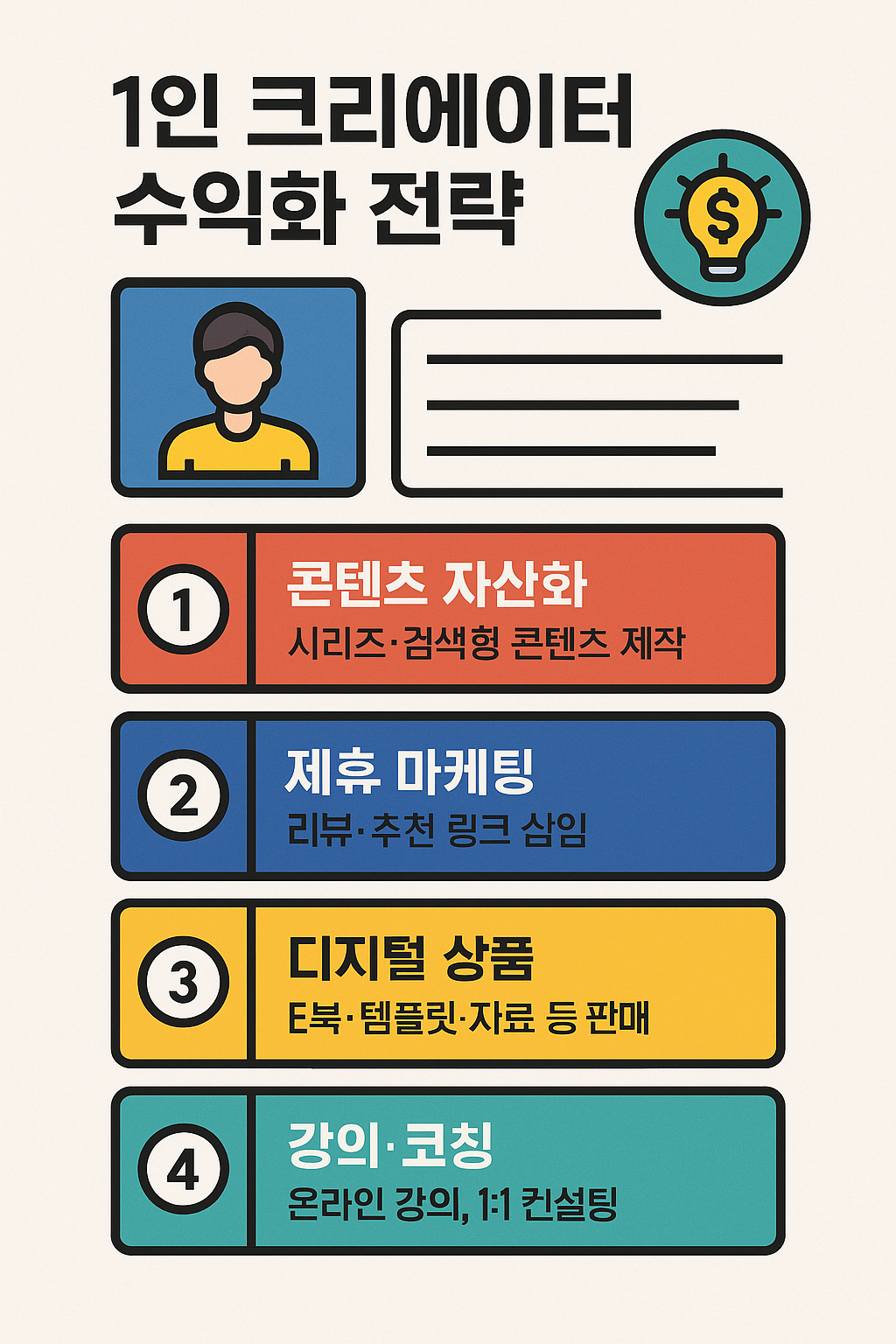 오늘은 초보자도 당장 적용할 수 있는 1인 크리에이터 수익화 전략 5단계를 정리했다. 단순히 콘텐츠를 만드는 것을 넘어 “비즈니스 모델”을 만드는 관점에서 접근해보자.