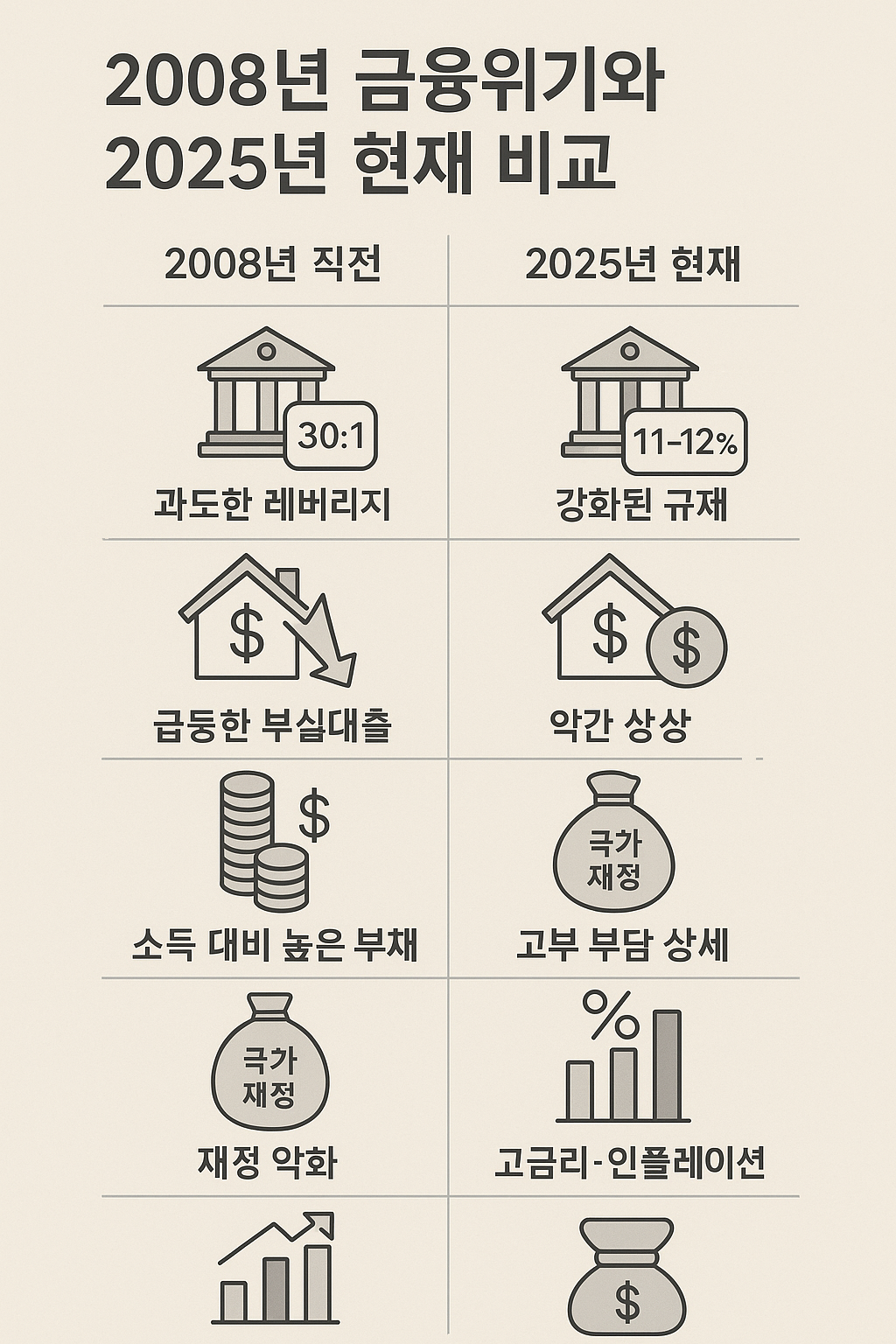 2025년 현재 상황은 2008년 직전과 똑같지는 않지만, “유사한 위험 신호”가 곳곳에서 나타나고 있습니다.